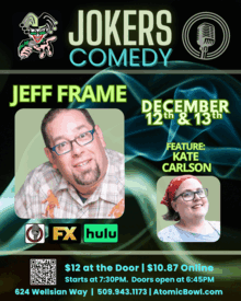 Jeff Frame brings a unique brand of personal storytelling and relatable insights into everyday situations, with a friendly demeanor and an every-man persona, its easy for audiences to quickly feel like theyve known him for years. He is self-deprecating, honest & relatable while talking about kids and family, weight issues and why you should never have parrots as pets. Jeff is the co-host of the Who Did It First Podcast. He's been seen on season 5 of the FX show Youre The Worst. He's also been seen in the Amazing Johnathan documentary on Hulu. Jeff has won both the San Diego & Minneapolis satellites of the World Series of Comedy & made the Final 9, out of over 400 entrants, at the national competition in Las Vegas. In addition to being a comic he is also the director and producer of the Comedy documentary Bert Kreischer: I Am The Machine.