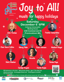 John Thomas, Frankie Campofelice, Chan Varon Collins, Marcy Feller, Zack Johnson, Madison Mayer, Mark Meehan, Mozelle, Denise Page, Carolyn Rogers and Fermín Rojas create a potpourri of upbeat, perky, humorous and inspirational music without borders, perfect for the holiday season and our love of community. The concert setting is stunning, featuring a multi-story ceiling and trompe loeil art on the walls that give the sanctuary the feel of a three-dimensional palace. Concert series producer John Thomas says, The atmosphere is refreshing, pleasant, and inspirational, and the live music experience here is sublime.