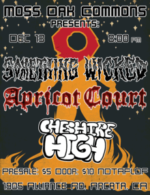 On Saturday, Dec 13, 2025, head over to Moss Oak Commons in Arcata, CA for a stacked punk line up featuring Cheshire High, Apricot Court (from Pacific Grove), and Something Wicked. Pre-sale tickets are only $5, tickets at door are $10, but as always this show is NOTAFLOF so if there's room inside, come join the fun!
