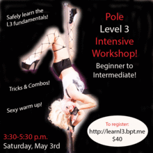 Join me for two hours of intensive focus on SAFELY learning LEVEL 3 Beginner through Intermediate pole skills! This workshop is designed for those who want a solid grasp on the Level 3 FUNDAMENTALS before venturing into the riskier moves in Advanced Level 3 classes.