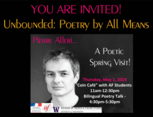 Thursday, May 1 at the Alliance Française de Seattle (room 204), two chances to meet French Poet Pierre Alferi : "Coin Café/Croissants" with Alliance Française de Seattle Students and Members - 11am-12:30pm, Bilingual Poetry Talk - 4:30pm-5:30pm.