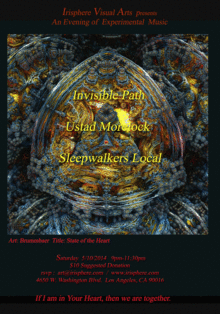 Invisible Path is a musical vessel for the cosmic sound explorations of Michael Bailey. His music is an avenue to explore experimental/psychedelic/minimal/cosmic music and to work with and around sound techniques such as feedback manipulation, found sound, alternate tunings, unorthodox instrumental treatments, tape manipulation and multi-instrumental performance. The goal is to carefully apply these various sonic forms through solo and collaborative improvisations with the intent to explore ideas such as universal consciousness, deep listening, physical harmonic effects, musical conversation and unexplainable feelings/sensations. A large component of the performance aspect is meditation, in the sense of allowing oneself to play what is heard within and to project it outward. The music will inspire your imagination and takes your mind off to distant places. (MB) http://theinvisiblepath.bandcamp.com/