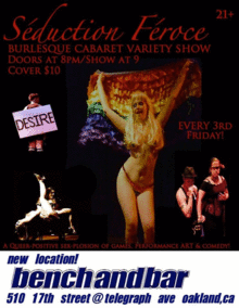 Séduction Féroce has been consistently providing sexy, diverse, boundary-pushing quality entertainment to the East Bay since 2012, making it one of the most successful and inclusive monthly variety shows in the area! In April they expanded to a BIGGER and BETTER venue at Bench & Bar in Oakland, and they now take over the stage every 3rd Friday of the month! Friday May 16th's show boasts a SIZZLING line-up of burlesque, drag, spoken word, and circus performances! Featuring incredible performances by Joyce Lee, Andi Stardust, Snatch Adams, Kim Burly, The Tartlettes, and Mojo Deville! Hosted by Wonder Dave and Vegas Jake! Produced by Roma Mafia & Holly Honeypocket! Get there early and stay all night to indulge in the musical stylings of DJ Lady Ryan and the jaw-dropping deliciousness of our go-go dancing babes! See you OUT!