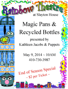 Rainbow Theatre at Slayton House will continue this season's series with a performance of "Magic Pots and Recycled Bottles" presented by Kathleen Jacobs & Puppets on Friday, May 9, 2014. A wacky cleaning lady "recycles" discards into a crew of unforgettable puppet characters and "recycles" old folktales into a script. With assistance from the audience, the puppets perform hilarious versions of the old tales. Performance is at 10:00am in the Slayton House Theatre in the Village of Wilde Lake in Columbia. END OF SEASON SPECIAL $2 PER TICKET. For information call 410-730-3987. Sponsored by Wilde Lake Community Association.