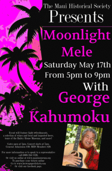 The Maui Historical Society Presents Moonlight Mele, with performances by George Kahumoku. This event will feature arts and craft vendors, light refreshments, and alcoholic beverages.