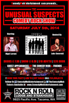 Saturday July 5th, 2014 Comedy Mob Entertainment presents "The Unusual Suspects Comedy Show", starring one of the Northwest's funniest comedians, Nigel Larson. The show will be hosted by Comedian Luke Severeid. The show will include guest appearances by some of the wildest comedians in The Comedy Mob & their Funny friends. This exclusive event will also have live rock music provided by the talented Eddie Georg.