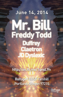 Mr. Bill, Freddy Todd, Duffrey, Claetron and JD Dyslexic at the Refuge on Saturday, June 14th, 2014. Doors at 8pm. Presale $15, Door $20. 21 and up. More info at http://on.fb.me/1qnsL9n