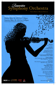 Final concert of the season includes the finalists from our Washington County Young Artists competition. These students represent 3 local High Schools Sunset HS, Catlin Gable and Beaverton Arts & Communication High School. The Program: Matt Doran Comic Overture Young Artist Concertos featuring winners of our Young Artists Competition Camille Saint-Saens Introduction and Rondo Capriccioso Connor Foubister, Violin (10th grader from ACMA) Ludwig van Beethoven Piano Concerto No. 3 in c minor, 3rd movement Allina Chang, Piano (9th grader from Sunset HS) Antonin Dvorak Cello Concerto in b minor, op. 104, 1st movement David Kim, Cello (10th grader from Catlin Gabel)