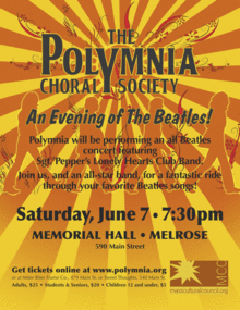 Polymnia will be performing an all Beatles concert featuring Sgt. Pepper's Lonely Hearts Club Band. Join us, and an all-star band, for a fantastic ride through all your favorite Beatles songs!