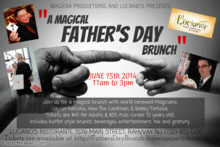 Father's Day Magic Brunch at Luciano's will be filled with magical moments from some of America's top performers! Torkova, Alex the Cardman and Jaysin Katsikis ~ The Magician will be presenting an amazing parlor and close up entertainment experience for ages 10 and up! Tickets are $40.00 for ages 12, anyone under 12 years of age $25.00 for an amazing buffet style brunch. Beverages included ~ Alcohol purchases are separate. www.TheMagicofJaysin.com for more details, bookings and private engagements!