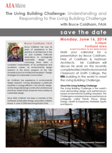 Mark your calendar for a presentation by Bruce Coldham, FAIA of Coldham & Hartman Architects. Mr. Coldham will discuss his work on the recently completed Bechtel Environmental Classroom at Smith College, the fifth building in the world to meet the Living Building Challenge.