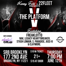 The Platform Showcase V at SRB Brooklyn!!! Kenny Fort x 22 Fleet brings you the 5th installment of The Platform Showcase at SRB Brooklyn with performances by FREAKLotto, NAK, Legacy Hearttbreaker, S. Paradise, Ju$$-B, Stash Lomain, & Claymore. Doors open at 7pm with performances starting at 7:30pm SHARP. Advance tickets now available here for $10, admission $15 at the door.