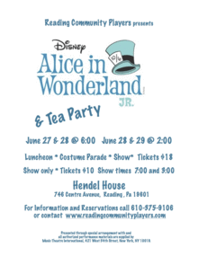 Reading Community Theatre is delighted to announce our production of Disney's Alice in Wonderland, Jr. In addition to the musical retelling of Alice's adventures, the theatre is also providing the opportunity for audience members to enjoy a tea party and costume parade before each show.
