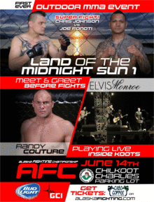 For the first time EVER AFC and Chilkoot Charlie's will host AFC Land of the Midnight Sun 1" an outdoor MMA event, Saturday June 14th! Join us for this exciting first under the windmill in Spendard in the parking lot of Chilkoot Charlie's!! Main event will be a 205lb super fight between Chris Johnson vs. Joe "Unleashed" Fonoti. Both fighters are stand up specialists with this fight sure to end in a knockout! Special guest appearance by UFC legend Randy "The Natural" Couture for a meet and greet and autograph signing. Then right after the fights join us inside for a live performance by Elvis Monroe ! Join us as we make history with the first ever AFC outdoor event! Doors open at 4pm for the Randy Couture meet and greet and first fight at 6pm ! After the fights join us inside Koots for a live show by Elvis Monroe! Free Admission with ticket to the fights! Tickets on sale buy calling 907-351-8184 or at all 5 Cabo Coffee locations! See you at the fight!