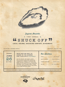 Join us for our First Annual Shuck Off at Sazerac Restaurant. Watch our "contestants" compete to see who can shuck the most oysters in a timed event, nosh on bites from the kitchen (including delicious, local oysters), wash it down with tasty beverages and get the chance to win some fabulous prizes!