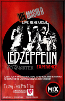 Join No Quarter for a limited access "Unmasked" rehearsal, as they work out new and old tunes for the upcoming Showare Center show later this month! Donations will be accepted and proceeds to benefit Musicares of the Northwest.
