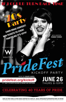 Cher was big in the 70s, and so was a little thing called "Gay Pride". Seattle, let's celebrate 40 years of Pride by a kickoff party worthy of all the years of progress and, well, worthy of Cher! Bring your 70s swagger to the Pride Kickoff event of the season, brought to you by Seattle PrideFest and the W Hotel Seattle. There will be a drag contest, live numbers, music, appetizers, and drinks (2 included with price of admission). You won't want to miss this party!