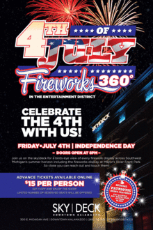What are you doing for the Fourth of July? Join us on Sky|Deck for a birds-eye view of every firework display across Southwest Michigan's summer horizon Friday night. We've all seen fireworks from ground level, but now is your chance to see them from the top of the skyline, with bursts that seem close enough to touch. Come celebrate Independence Day with us on Sky|Deck.