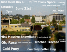 Day 1 - Saturday June 21, 7pm Oh, Rose, from Olympia!: http://ohrose.bandcamp.com/ Miss Massive Snowflake, from Portland!: http://missmassivesnowflake.com/ Cold Pony: http://coldpony.bandcamp.com/ Trochee Trochee - tape release! Courtney Cotter King: http://courtneycotterking.com/