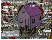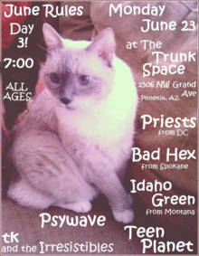 Day 3 - Monday, June 23, 7pm Priests - from DC! On Don Giovanni Records: http://priests.bandcamp.com/ http://666priests666.tumblr.com/ Bad Hex - from Spokane!: http://BadHex.bandcamp.com/ Idaho Green - from Montana!: http://idahogreen.bandcamp.com/ Teen Planet - final Phoenix show! Psywave: http://soundcloud.com/psywave666/interstellar-suitcase/s-FdHZR TK and the Irresistibles - 2-year anniversary!: http://tkandtheirresistibles.bandcamp.com/