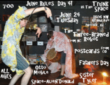 Day 4 - Tuesday, June 24, 7pm The Three-Brained Robot - mind-crushing performance art from Greensboro, NC!: http://typtapes.bandcamp.com/album/magic Postcards - pop-punk from Colorado: Http://Facebook.com/postcardsofficial Fathers Day: http://fathersday.bandcamp.com/ Space-Alien Donald: www.youtube.com/watch?v=2gFZonsksHI Sister Tyler: https://www.facebook.com/sistertyyler Otto Mobile