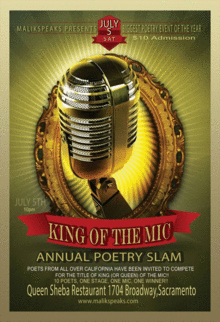 I am proud to announce that the King of the Mic Night will be held on July 5th, 2014 at Queen Sheba. For those of you who know, the King/Queen of the Mic is the MOST exciting poetry event of the year!! Poets from all over California come to Sacramento to compete for the Angela Boyce Trophy and $300 in cold cash! (This is a poetry invitational, and not an open mic..each poet has been invited to compete, so you get only the best of the best)