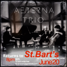 Aeterna Trio, featuring Ben Birkbeck, Andy Happel and Devon Colella. -The Aeterna Trio will be performing originals as well as crossover from classical music into rock and roll and beyond. In addition, Aeterna will have moments of improv and composition of songs in real time.