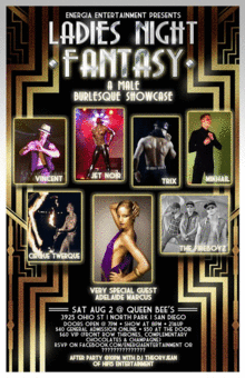 San Diego-based Energia Entertainment presents another sensational Male Burlesque Showcase!! Watch your fantasies unfold before your eyes at LADIES NIGHT: FANTASY on August 2, 2014 at Queen Bees. Merging visual and performing genres, this night of fantasy will highlight local and international professional dancers representing ballroom, modern, hip hop, and cirque acts, all in the style of nouveau burlesque. We're bringing back some of your favorites including Jet Noir, Trix, and the Fireboys, along with bringing some exciting new and seasoned performers to our burlesque stage, featuring special guest Adelaide Marcus!
