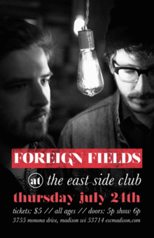 Foreign Fields - (Nashville, TN via WI) is an electronic folk group that hails from the wintry plains of Wisconsin. New Years day of 2011 they met in their hometown, in an abandoned office building, to begin work on their first full length LP "Anywhere But Where I Am". Having no set plan or guide, the album grew naturally as they left their lives in the north for the rivers of Tennessee. Days after self-releasing on Bandcamp in January 2012, the album began to catch the attention of notable tastemaker blogs and worldwide critics alike. "Stumbling upon an album as good as this duo's debut LP is not the kind of luck that happens every day. Eric Hillman and Brian Holl's music has the depth of a deep green lake, one you watch through the seasons; from summer swimming to frozen white. The richness here is full and deep, and you should find a good long book and a quiet corner and listen to the entirety of this record over and over with headphones and a pot of hot tea." YVYNYL "I cannot wait for the world to discover this album: beautiful, romantic, simple, sweet, intelligent. We overuse this phrase but this is truly a gift for your ears, an escape into something deeply wedged into the beauty of calm. It's the type of album you'd think you'd fall asleep to, but in a way it really awakens you, to absorb the words and to feel the emotion as they, themselves work through them. This album will haunt you for the rest of your life." The FiveThreeSix