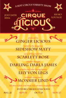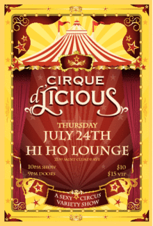 CIRQUE D'LICIOUS July 24th, 2014 Thursday HI HO LOUNGE, 2239 St. Claude Street Doors 9pm, Show 10pm Tickets $10 General Admission, $15 VIP seating Advance Tickets available: