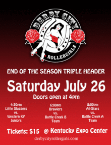 The ticket holder assumes all risk incidental to the game of roller derby whether occurring prior to, during, or after the bout. Including (but not exclusively) the danger of being injured by or in connection with any participant of the bout. Ticket holder agrees Derby City Rollergirls and its associates are not liable for any resulting injuries. Ticket Holders consent to being photographed, filmed or taped, by DCRG, or by third parties appointed and/or authorized by them.