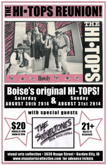 Hi-Tops,reunite for two special concerts at Visual Arts Collective (VaC) with special guests The Swiveltones. Saturday, August 30th and Sunday August 31st Tickets are $20 in advance Available online at Brown Paper Tickets and Record Exchange. Doors open at 8 pm - Show at 9 pm. 21+ valid IDs required.