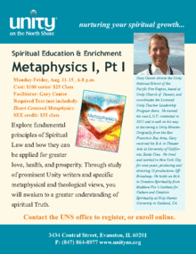 EVOLVE Metaphysics I, Part 1 Mon.-Fri. Aug. 11-15, 6 8pm Facilitator: Gary Canier, LUT $100 series/$25 per class SEE Credit Available $35 Explore some of the fundamental principles of Spiritual Law and how they can be applied for greater love, health, and prosperity. Through study of prominent Unity writers and specific metaphysical and theological views, you will awaken to a greater understanding of spiritual Truth. Learn how to realize more of your spiritual potential and find that your life is transformed. Required Text: Heart-Centered Metaphysics.