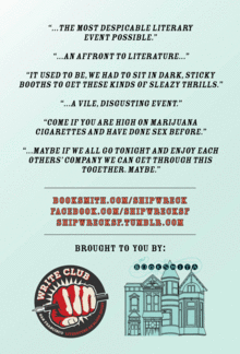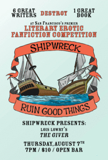 Six Great Writers will destroy one Great Book, one Great Character at a time, in service of the transcendent and the profane (and also laughs). Marvel as beloved characters are plucked from their worlds and made to do stuff they were never meant to do in places they were never meant to see. You choose the best Ship. The winning writer chooses their character for the next Shipwreck, and returns to defend their title.