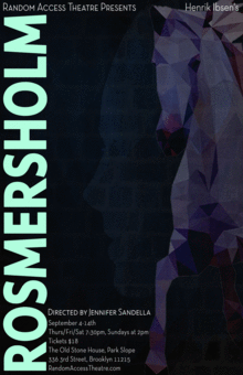 Random Access Theatre presents a riveting new version of Henrik Ibsen's haunting and poetic masterpiece Rosmersholm. Hailed by critics to be Ibsen's greatest work, Rosmersholm is a psychologically thrilling love story of an unlikely pair of passionate social progressives.