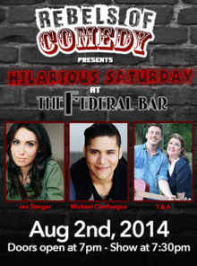 Rebels of Comedy presents Hilarious Saturdays at the Federal Bar in North Hollywood. Come out and see a night of live comedy, featuring an awesome lineup of professional features and headliner comedians. Featuring the show's headliners : Jen Sterger, Michael Cienfeugos, T and A