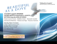 A unique opportunity to hear the exquisite sacred motets of Renaissance composer Raffaella Aleotti alongside settings of similar texts by her famous contemporaries: Gregorio Allegri, Alessandro Scarlatti, Francisco Guerrero, Tomas Luis da Victoria, Giovanni da Palestrina, and Clemens non Papa. Includes the beloved "Miserere" by Allegri and several settings from the Renaissance favorite, the Song of Songs.