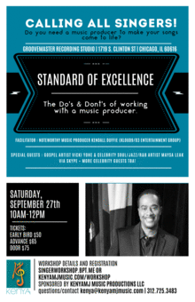 "A Standard of Excellence" is for developing independent vocalists/artists and producers. The workshop will highlight best practices while working with a music producer. Noteworthy music producer/musician Kendall Duffie (part of the soul/R&B duo group Kloud 9 and VP of D3 Entertainment Group) will facilitate this engaging workshop discussing a variety of topics related to independent artists working with music producers. In addition, attendees will participate in a live Skype session with celebrity special guests including Soul/Jazz/R&B artist Maysa Leak (formerly with soul/jazz international group Incognito)and gospel recording artist Vicki Yohe. *Light refreshments will be served.