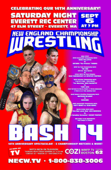 New England Championship Wrestling celebrates its 14th anniversary with its biggest event of the year, BASH 14, Saturday night, September 6 at the Everett Rec Center, 47 Elm Street, Everett, MA with a 7 PM bell time.