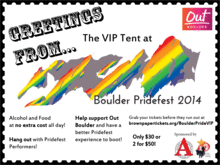Be a part of Boulder Pride's VIP Experience! Your ticket will provide you entrance to the VIP Tent where you will be serving Avery Beer along with food from Savory Cuisines. Plus you can meet and mingle with our stellar lineup of performers.