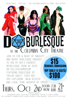 Join us for a night of naughty nerdy burlesque brought to you by NYC's favorite nerdlesque show as seen on collegehumor.com. Featuring burlesque by Taylor Sweet, Tiger Bay, Iris Explosion, Anja Keister and local star Whisper De Corvo!