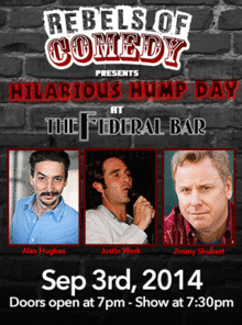 Rebels of Comedy presents Hilarious Hump Days at the Federal Bar in North Hollywood. Come out and see a night of live comedy, featuring an awesome lineup of professional features and headliner comedians. Hosted by Alex Hughes with the show's headliners : Justin Work, Jimmy Shubert