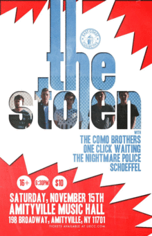 East Coast Collective proudly presents November 15th, 2014: The Stolen w/ The Como Brothers Band One-Click Waiting The Nightmare Police Schoeffel AT: Amityville Music Hall 198 Broadway, Amityville, New York 11701 16+ Doors at 6:30pm Show start at 7:30pm