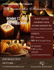 Join us October 17, 2014 for a harvest dinner at the Plaza Hotel. Begin the night with an informative wine tasting on the wines of BC, then tantalize your taste buds with a gourmet dinner prepared by Executive Chef Mike Swann of the Plaza Hotel. Be entertained by The Black Dog String Quartet and bid on some amazing silent auction items donated by the generous local organizations of Kamloops.