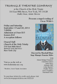 Triangle Theatre's next staged reading: Oscar Wilde's comic masterpiece, The Importance of Being Earnest. This witty and buoyant comedy of manners has delighted millions in countless productions since its first performance in London in 1895.