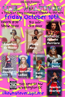 A time of POGs and Treasure Trolls, boy bands and girl power, scrunchies and combat boots, Friends and Saved by the Bell. Ellie Quinn Presents has assembled some incredible performers who share her love for the last great decade. Throw on our clogs and your yin yang necklace to witness this totally rad show!!