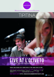 Musicvein Entertainment presents Tipitina live at award winning Italian restaurant L'Oliveto, Rutland. Join us, Friday 3 October, for an evening of fine 3 course dining and live music from Birmingham group Tipitina £25!