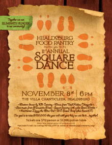 The 11th Annual Healdsburg Food Pantry Square Dance will feature a western dinner by KR Catering, wines from Toad Hollow, music by Manzanita Moon, square dancing with infamous caller Steve Minkin, and fabulous items up for bid, presided over by Chairwoman Susan Graf and auctioneer Ziggy the Wine Gal!