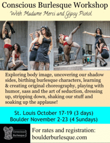 What: Exploring body image, uncovering our shadow sides, birthing burlesque characters, learning & creating original choreography, playing with humor, sass and the art of seduction, dressing up, stripping down, shaking our stuff and soaking up the applause!
