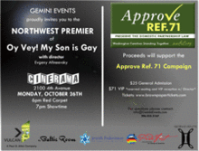Gemini Events proudly presents the NORTHWEST PREMIER of Oye Vey! My Son is Gay! Monday October 26th 6pm Red Carpet & 7pm Showtime. Proceeds will support the Referendum 71 Campaign for domestic partnerships in Washington State.